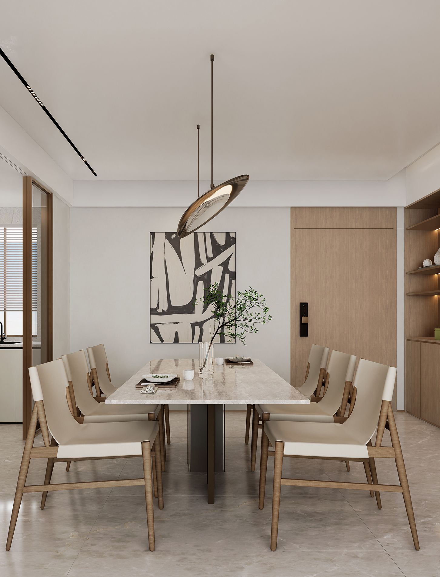 "千文万华"的匠气里,新旧相宜。 材质细节 檀木饰面,岩板铺陈,棉麻缀饰, 现代中式客厅藏东方温润气韵。 餐厅 SPATIAL EFFECTS视线逐渐从场景本身移转到对未 来生活的想象上。铜+云石灯饰 形似露珠,颇有自然的气息;精 致大理石的脉络里,像是流动 着有故事的"墨迹",东方与当 代合一。