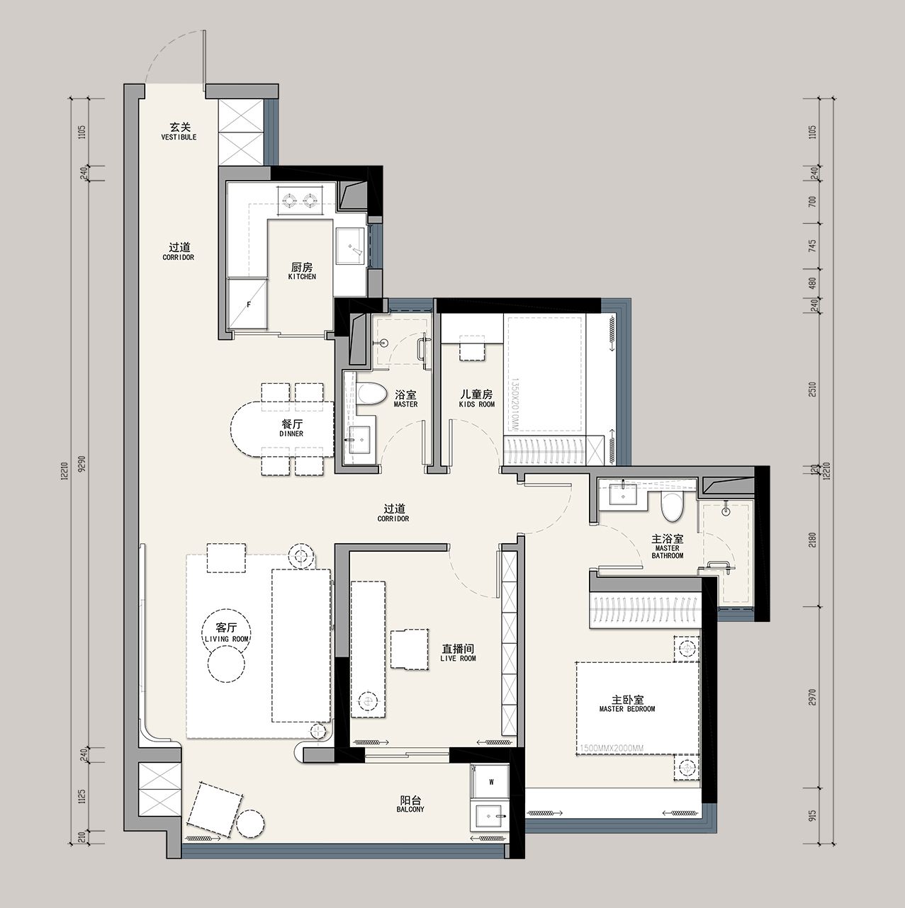 保持过道整洁、通畅。整个直播室以奶油作为