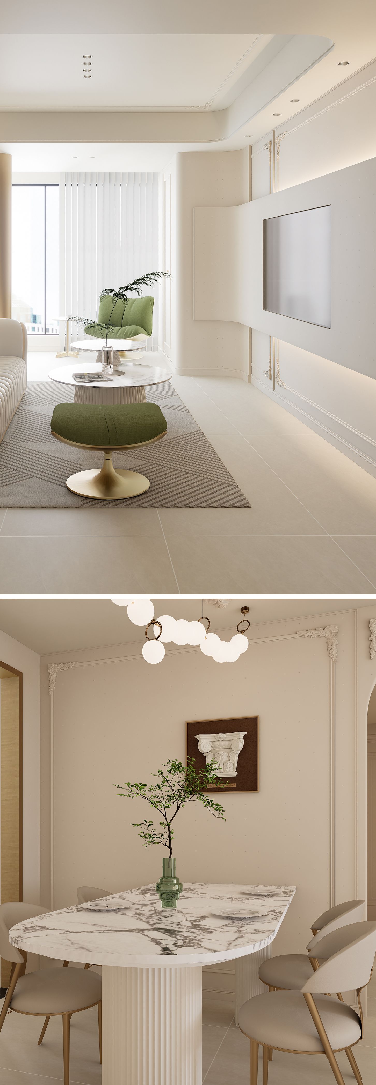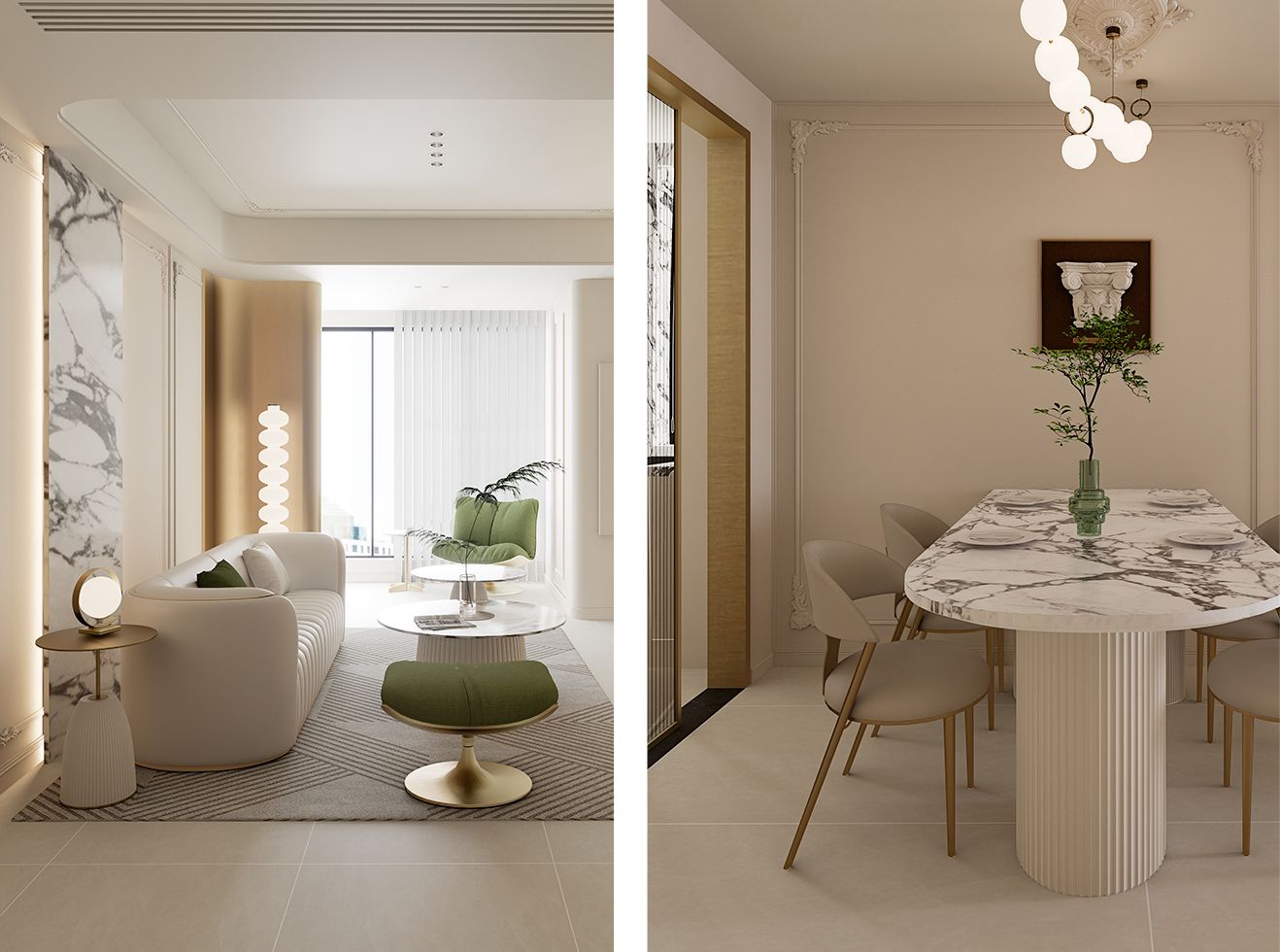柔中显精致;茶几是白台面 + 米白竖纹柱 + 金边,