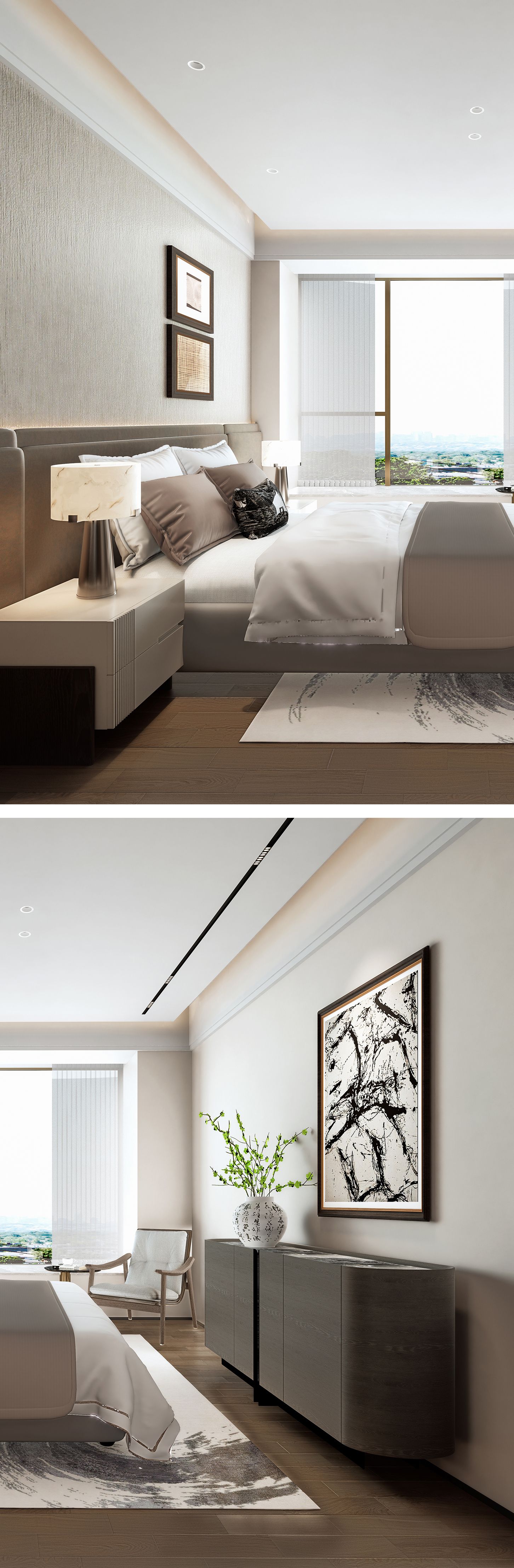亚麻墙布配胡桃木,云石灯映蚕丝床品,