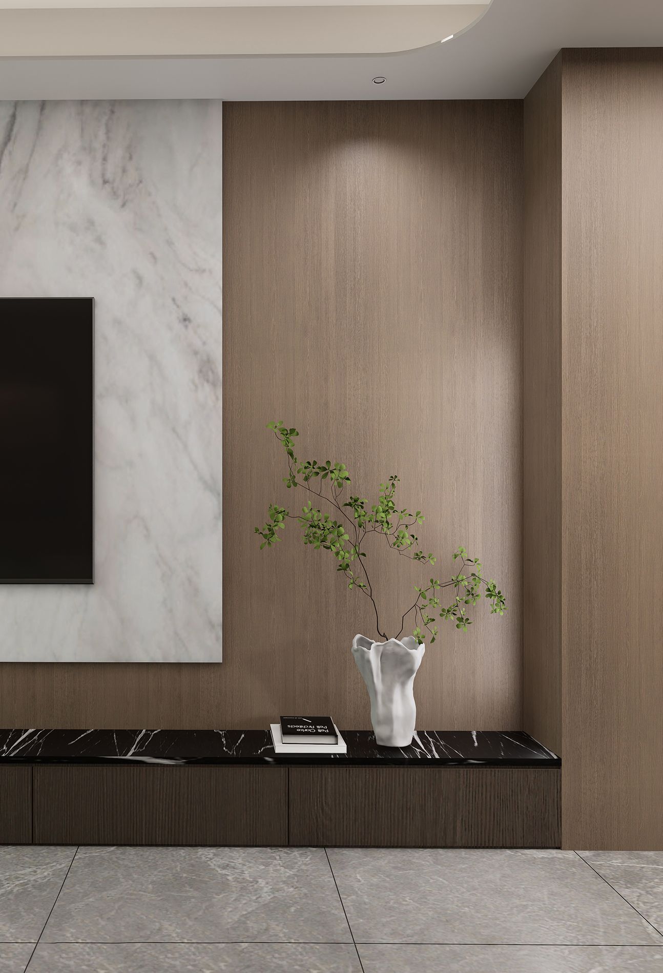 材质细节下半部分是浅胡桃木饰面,带有细腻的横向木纹, 表面哑光处理,触感温润;上半部分是浅米色艺术 涂料,带有细微肌理,与木饰面拼接过渡自然。
