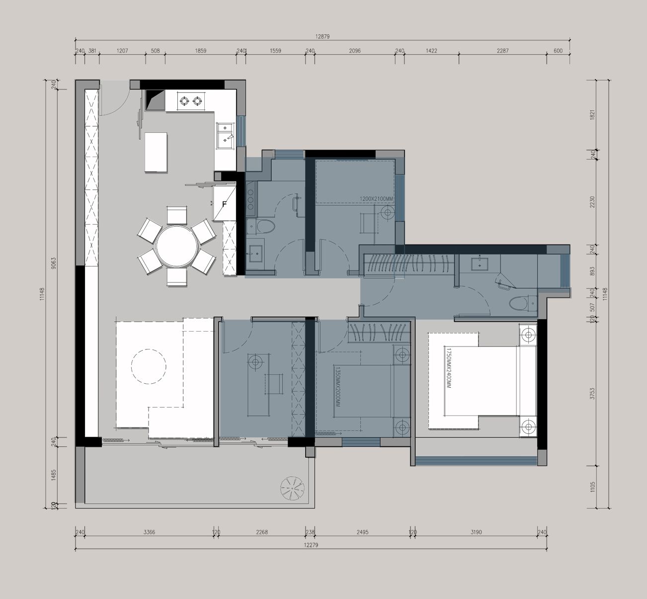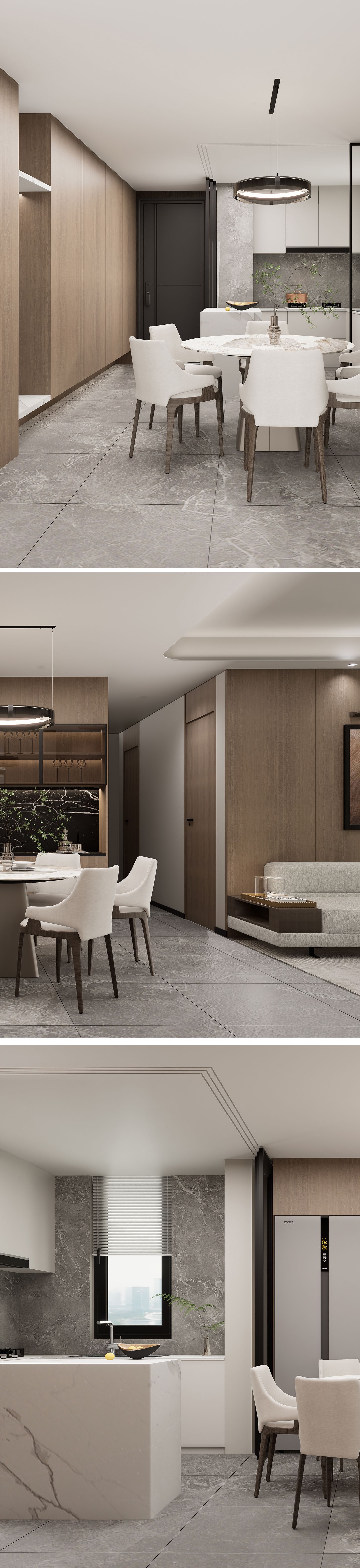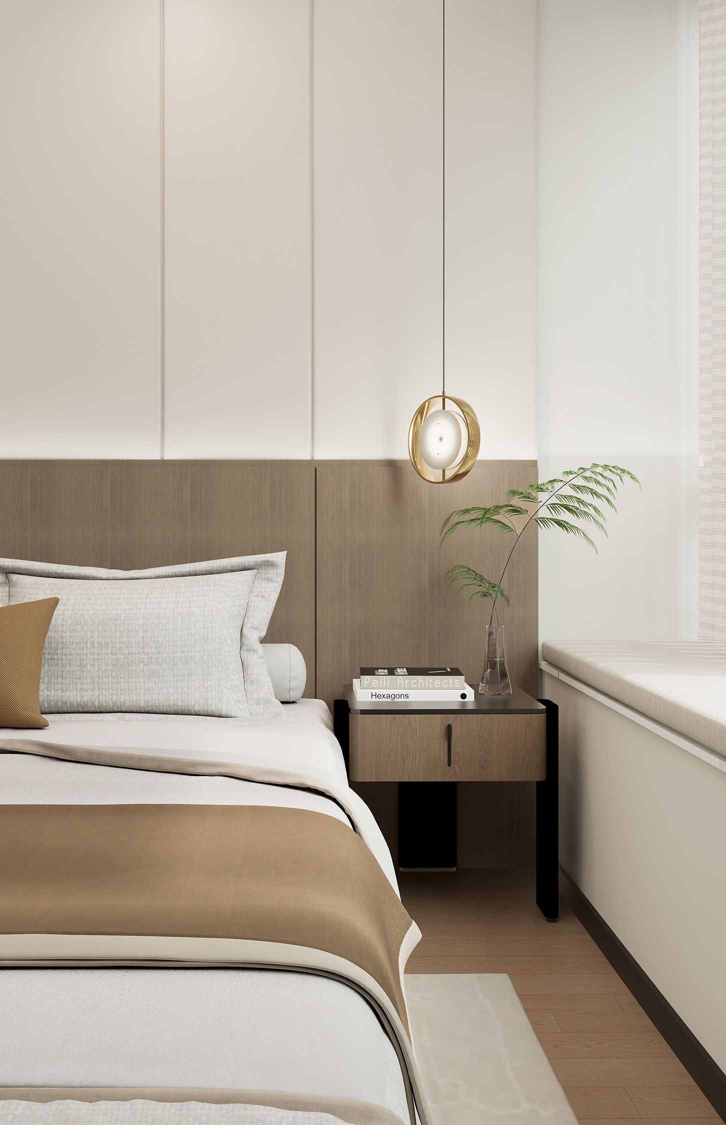 客厅 餐厅 客餐厅 SPATIAL EFFECTS大面积的木饰面与深色地面奠定了客 厅的沉稳基调,白色沙发的几何线条 勾勒家的时尚品味,自然绽放一室, 不失生活的柔软。客,餐,厨一体化 的空间布局,视觉上更显开阔的同时 拉近家人的互动,随着音乐的开启, 响起悠扬的乐曲,杯中佳酿更显醇厚 深邃,在这一方天地里可以肆意微醺。 材质细节 主背景墙采用浅胡桃木饰面,带有细腻的竖向木纹, 表面做了哑光处理,触感温润。 卧室 SPATIAL EFFECTS 选取柔和的中性色调,微微凹凸起伏的床 背景墙面如江水荡漾的线条,与室外水景 相融,平定了内心的浮躁。透过窗帘的光 影,找回属于自己的宁静角落,享受细节 里的美好点滴。