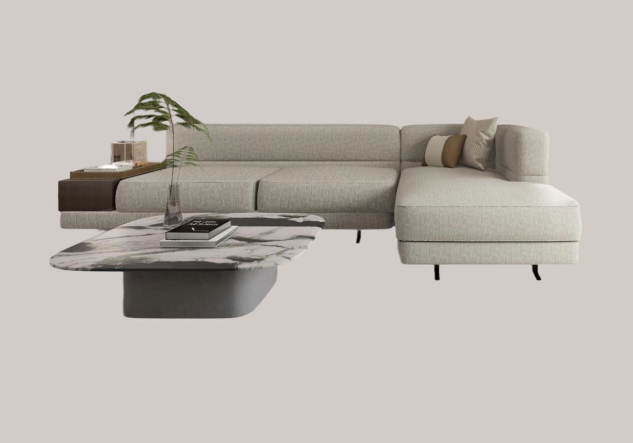 L型转角布艺沙发 采用浅米色高密亚麻布艺面料,表面带 有细腻的编织肌理,触感柔软亲肤且耐 磨耐用。