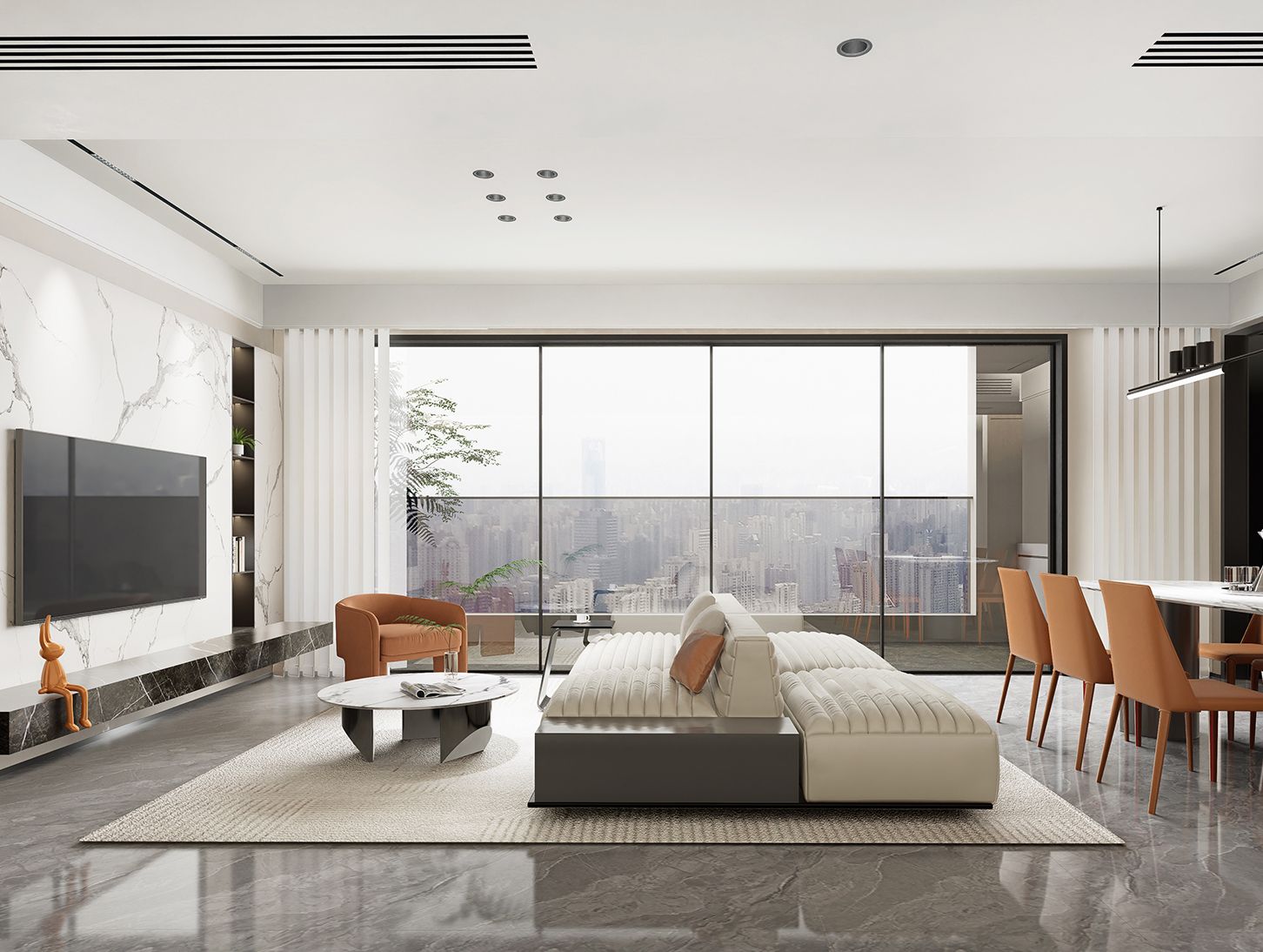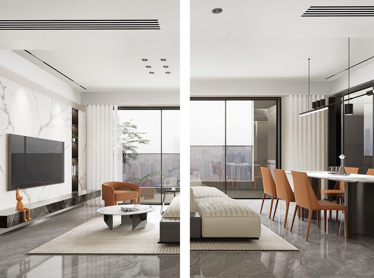 客厅 餐厅 客餐厅 SPATIAL EFFECTS客厅设计以现代时尚的简约风格为主, 营造出整洁、舒适的氛围。暖色的墙 面和时尚的背景墙相得益彰,为空间 增添了一份精致和温暖。餐厅时尚大 方,橙色的餐椅搭配大理石台面餐桌, 使整个空间温馨舒适。 材质细节 竖向木饰面衬岩板背景墙, 磨砂皮沙发配玻璃茶几, 金属点缀细节,营造现代简约氛围