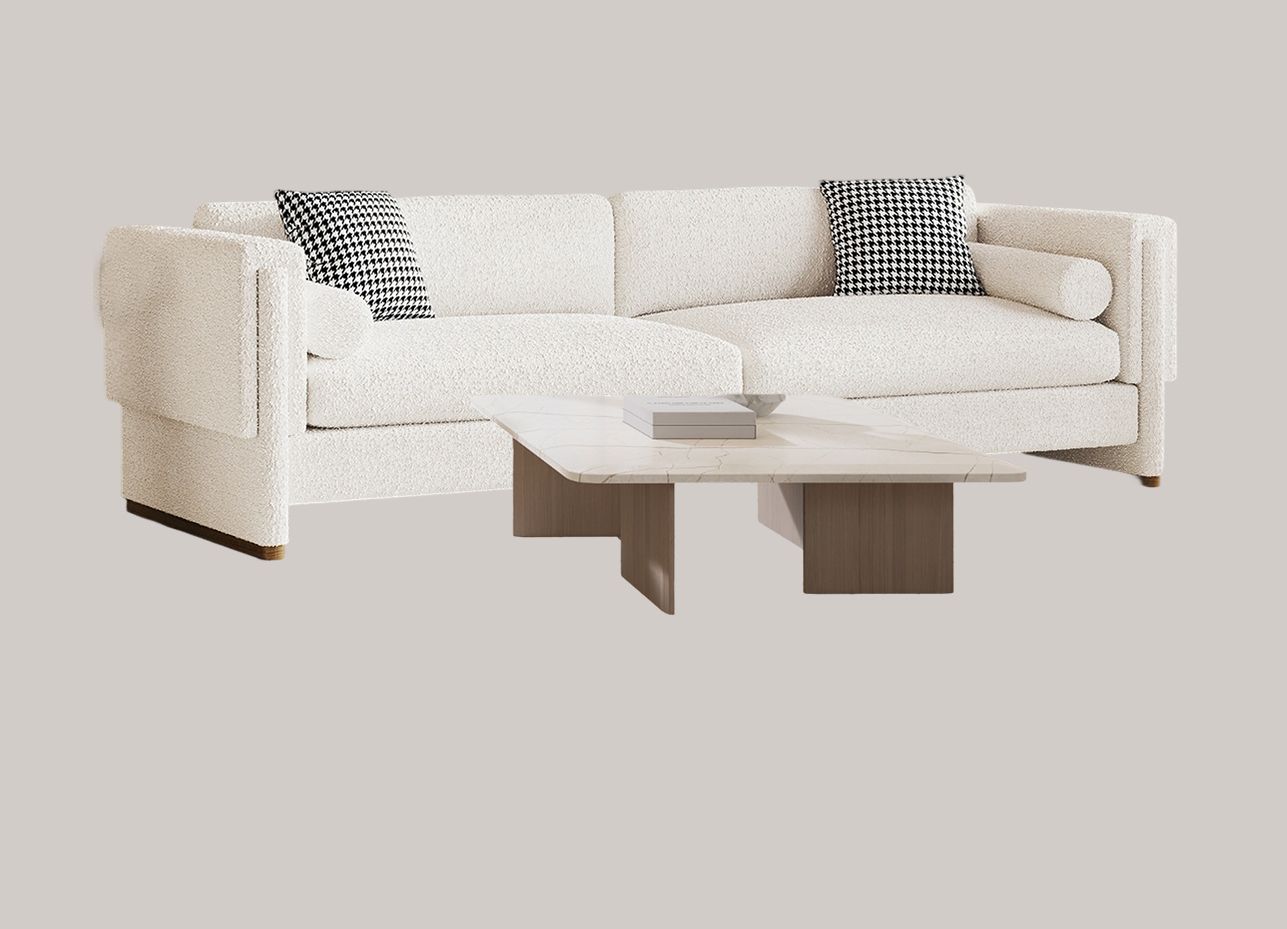 现代极简方形茶几台面采用浅色岩板 / 大理石,表面