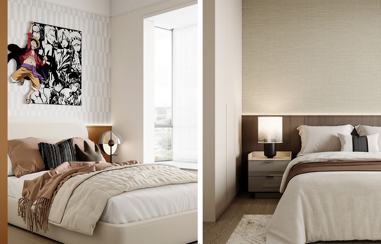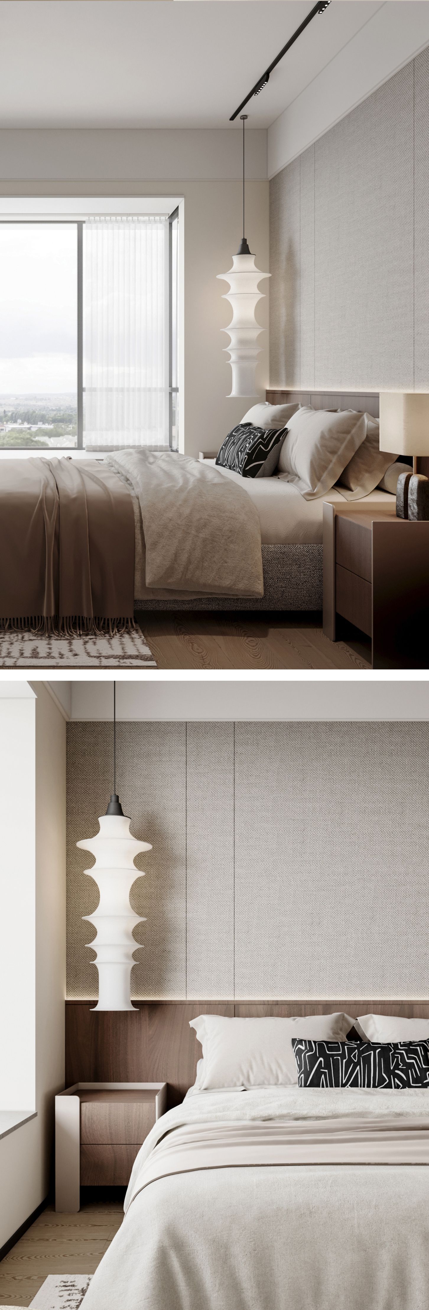 采用浅米色的肌理感壁布与深胡桃木饰面拼接,