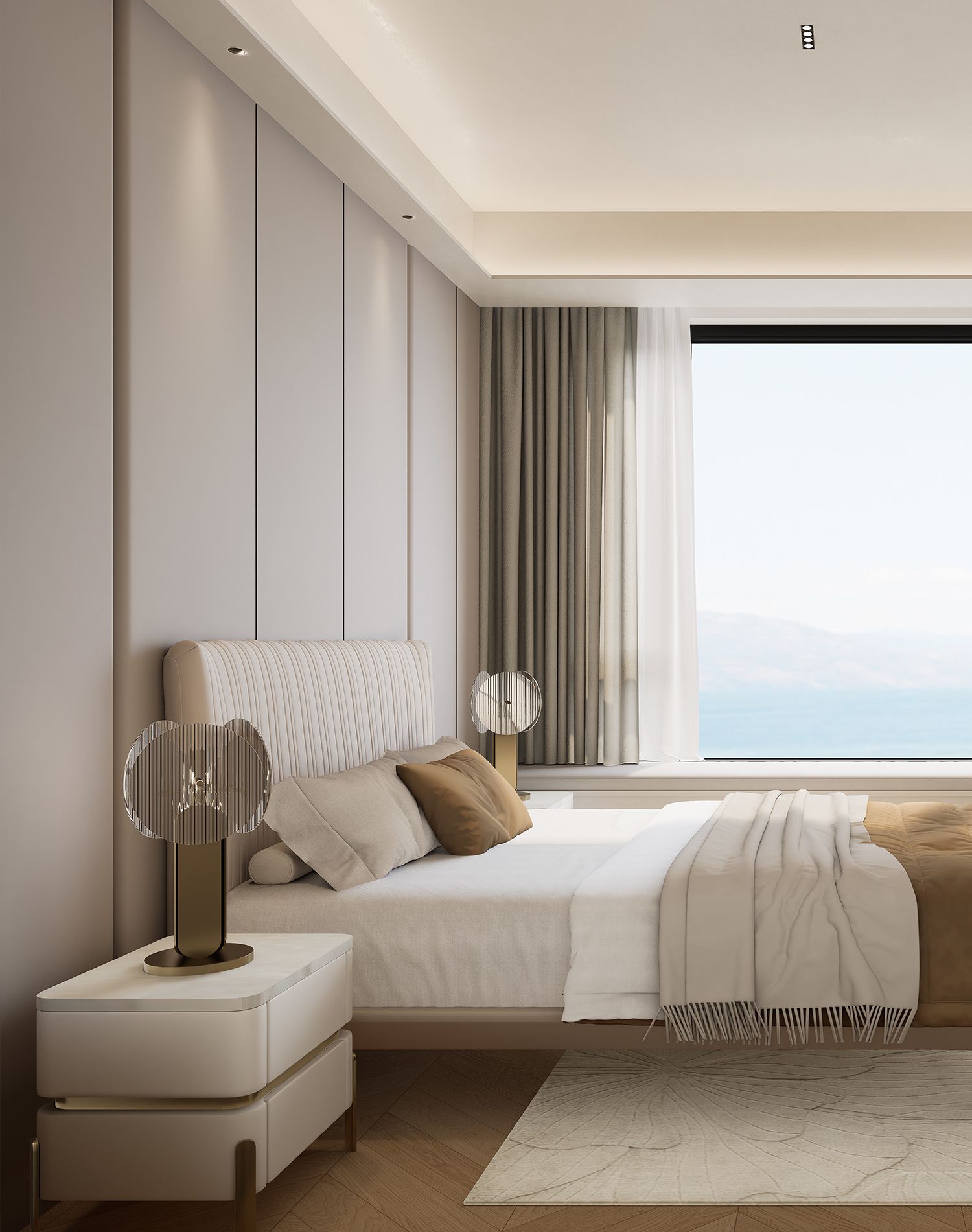 材质细节 多角度的金属曲面将浮光折射餐椅石材纹路 结合金属的弧线 是空间调性的点缀 卧室 SPATIAL EFFECTS 现代简约的卧室尽显雅致格调,营造 出静谧 舒缓氛围,大幅度飘窗引入充 沛的自然光线 尽享窗外好风光,金黄 色叶片的挂画,不经 意间与拐角窗外的风景不期而遇,米色基调 搭配简约线条,无需多余装饰。