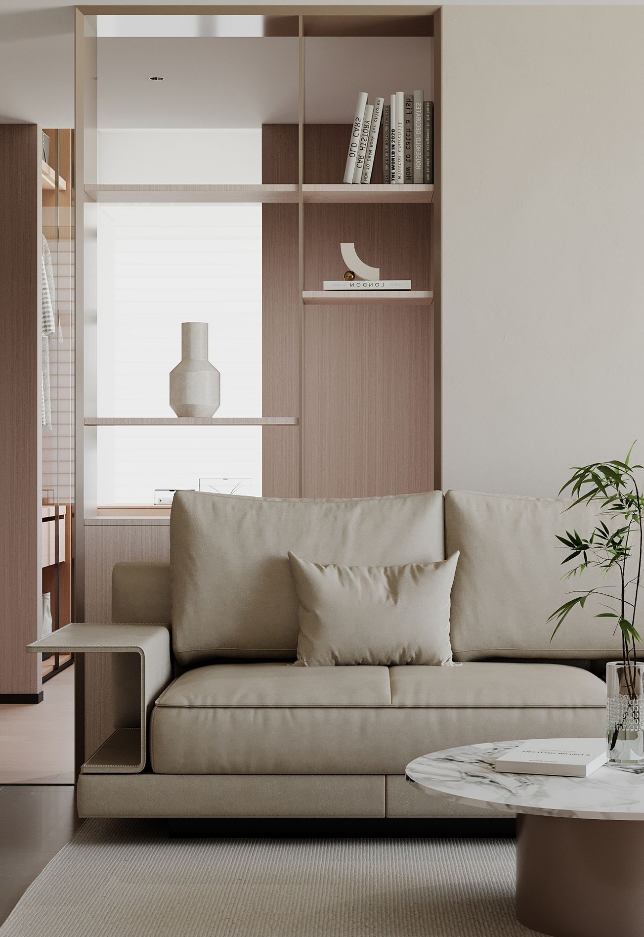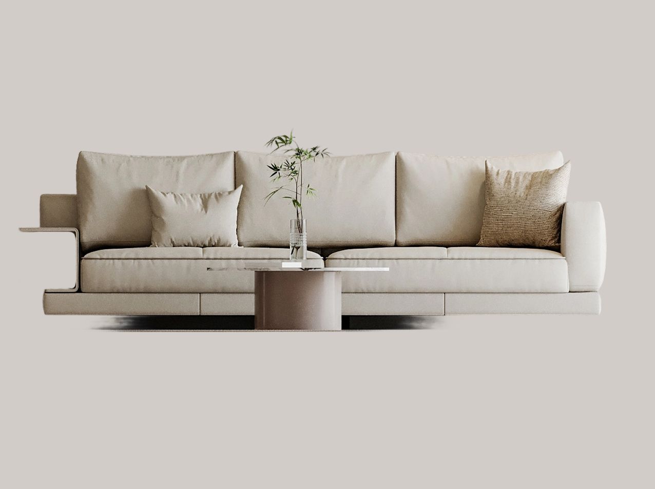 意式极简直排布艺沙发 采用低矮的直排造型,底部是一体化的 悬浮式底座,视觉上非常轻盈,弱化了 家具的厚重感。左侧延伸出的小台面可 作为边几使用,兼具设计感与实用性。