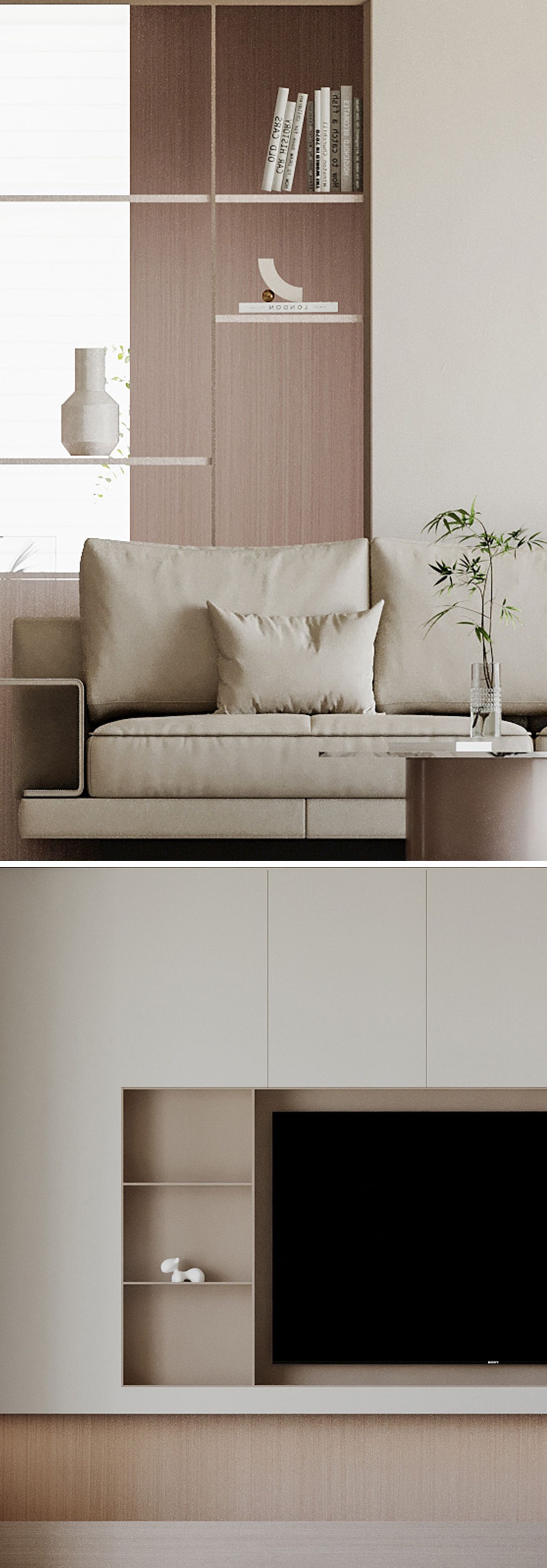 客厅 餐厅 客厅 SPATIAL EFFECTS今日,我们踏入的这间沐浴着原木风情 的私邸,暖暖的色调下,弥漫着无法掩 藏的浪漫情愫。客厅的空间里,艺术与 生活在这里巧妙交织,现代与传统亲切 对话。由空间布局到繁复的细节装饰, 皆是心思的巧妙延伸。原木与石材的交 融,仿佛将自然的芬芳引入室内。每一 处都弥漫着温柔而悠然的氛围,唤起人 心中的宁静之感。 材质细节 采用深胡桃木饰面开放式格架, 搭配浅米色哑光乳胶漆墙面, 温暖的木质与柔和的墙面形成材