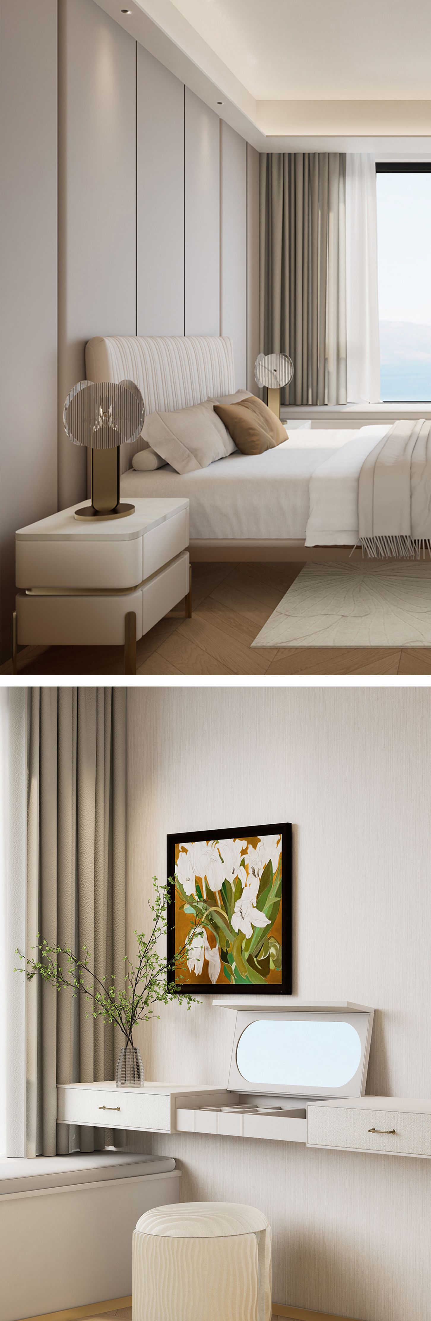 材质细节 多角度的金属曲面将浮光折射餐椅石材纹路 结合金属的弧线 是空间调性的点缀 卧室 SPATIAL EFFECTS 现代简约的卧室尽显雅致格调,营造 出静谧 舒缓氛围,大幅度飘窗引入充 沛的自然光线 尽享窗外好风光,金黄 色叶片的挂画,不经 意间与拐角窗外的风景不期而遇,米色基调 搭配简约线条,无需多余装饰。
